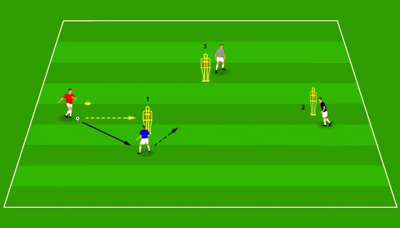 - The red player passes the ball to the blue player waiting by the first dummy and sprints towards mannequin 2.