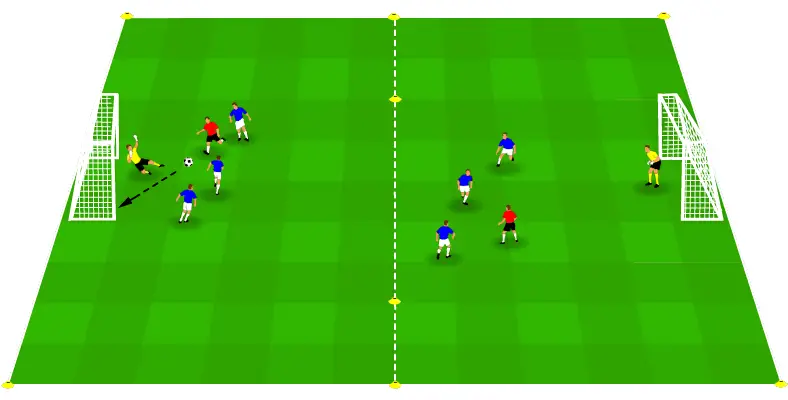 This drill fulfils two purposes: improving your team’s chances of scoring from long shots and preparing your defence to stop them. This exercise will improve: