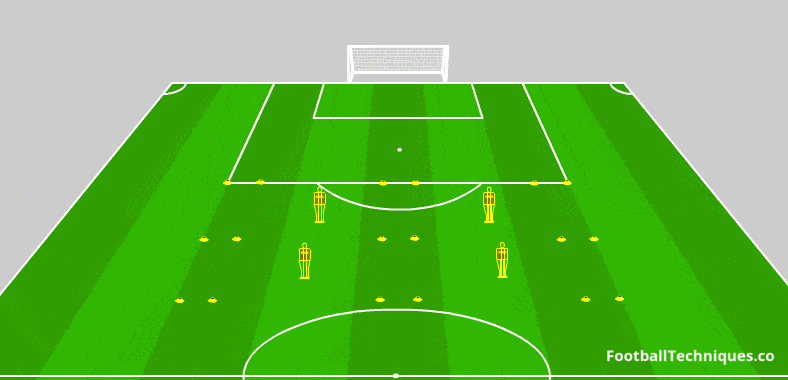 - When the starting player receives the ball between the two mannequins, they launch a long pass behind the second mannequin into the box. This last movement should set the running player with an opportunity to score.